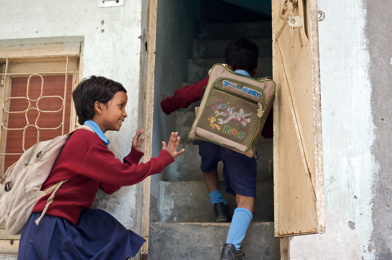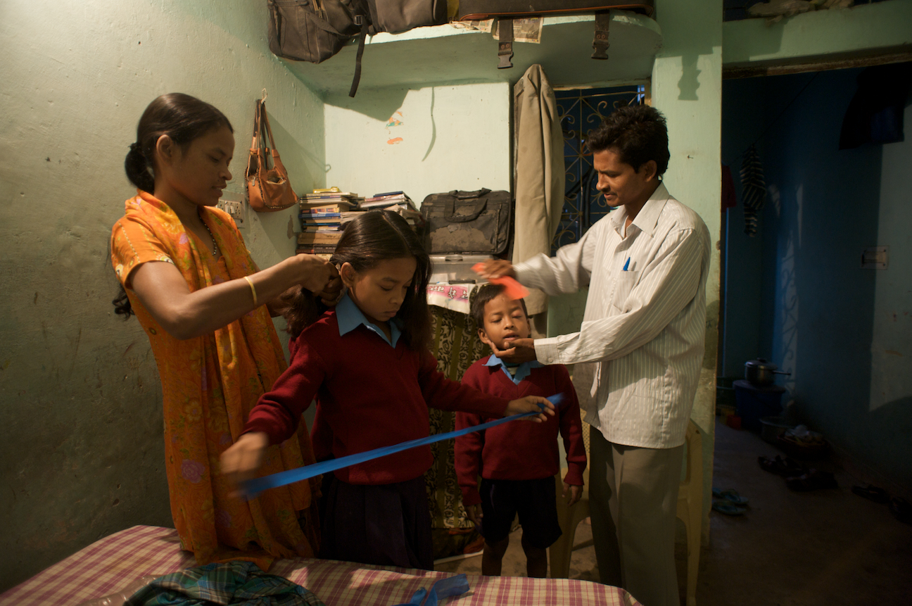 Jamima’s mother and father both help in getting the kids ready for school.