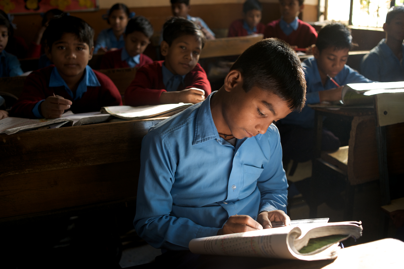 A young boy works on an assignment in his class at the Good Samaritan School in Dakshinpuri, Delhi.