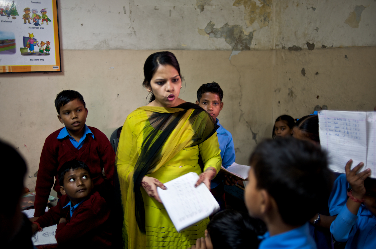 A young girl recites her homework in class at the Good Samaritan School in Madanpur Khadar, Delhi