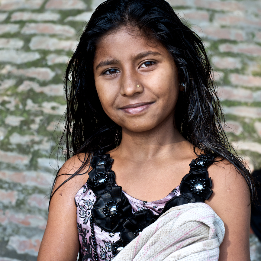 I like this portrait, there’s just enough light in her eyes.  She’s put on a new dress, but still has her towel tucked under her arm after her recent dip in the Ganges. The light is great, it’s natural, and it casts a nice glow. It’s rare that I crop a photograph, but I did crop this one to square because the brick in the background filled up much of the frame and it was distracting from the girl. This photo was made with a 50mm lens at f8 and 1/250. On this one too I might have benefitted from shooting at f2.8 instead. That would have given the background a little softer blur and perhaps made the girl stand out just a little bit more. I like it overall.