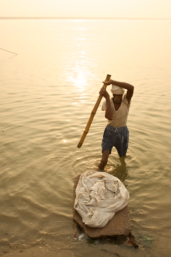 The word dhobi comes from the Hindi word dhona, which means, to wash. This is a very common scene along the Ganges River in Varanasi, India. What I like about this photo is the strong line on the horizon and the golden color as the sun reflects on the water, including one accented sun spot near the man’s bamboo rod. I like the tension in the moment as the Dhobi Wallah prepares his windup in anticipation of beating the clothes. A vertical orientation was necessary in order to exclude a line of several other washermen. There is one potentially distracting element in the photograph in that there is the line from a anchored boat in the upper 1/3rd of the photograph on the left hand side.