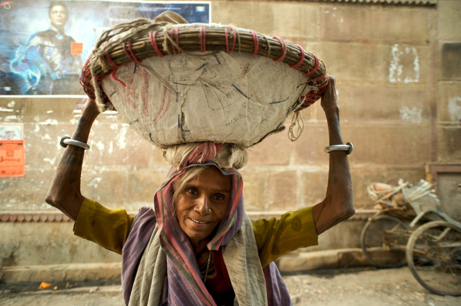 I think there is a lot to this image. It was one that I set up in advance when the noticed the poster of Shahrukh Khan, a famous Bollywood actor. I wanted to contrast the Bollywood poster with life in the alleyways of Varanasi. I can stay with this image for a while because there is a fair amount of detail to keep our attention; the woman’s basket, her clothing, her bracelets, the Bollywood poster and the tattered old rickshaw against the wall. What I don’t like is that I had not intended to have a posed shot, I was wanting to catch a more organic scene. Then this woman saw me photographing and actually posed for me without my asking. While I prefer a more neutral look, something less posed, there was a real pleasantness in our exchange and enough detail in the image for me to keep it.
