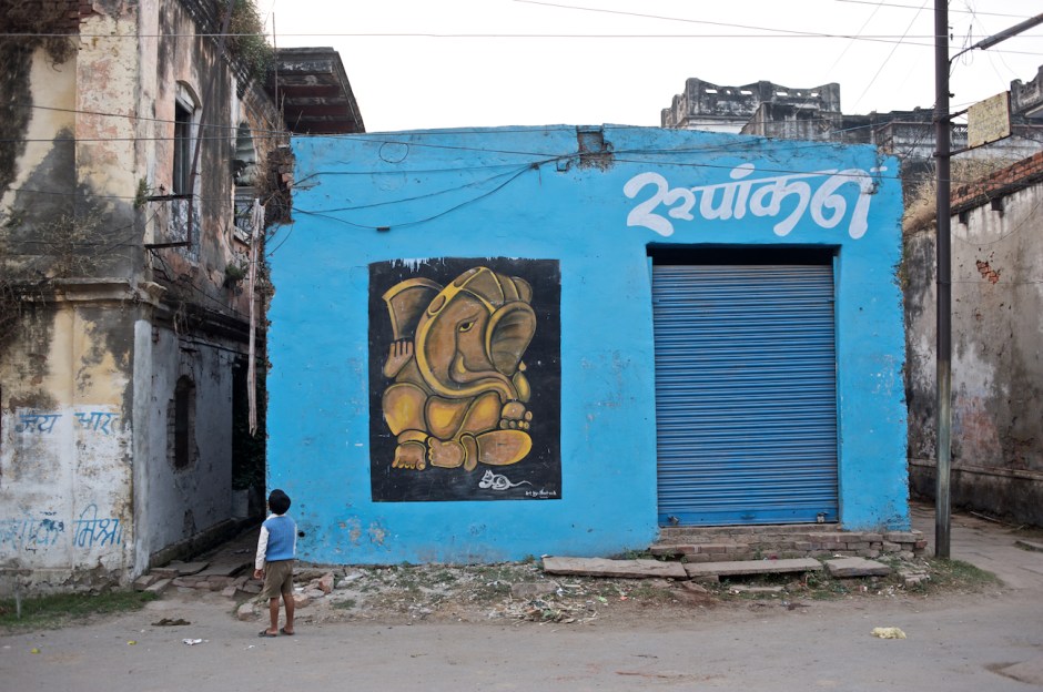 If you’ve ever been on the streets of Varanasi then you’ll know just what an unusual photograph this is. This was made in one brief moment between cycle and auto rickshaws passing, as well as people on foot, cows, etc. I like that the boy has on a blue sweater and is standing against a blue wall. What is he looking at? That question is one strength of the photograph. Had I  taken a half-step to the left I could have placed his head a little more completely against the blue background, a move that might have strengthened the image. This would also be a good time to take two successive images, one showing the boy alone on the street, the next showing him surrounded by activity. Next time.