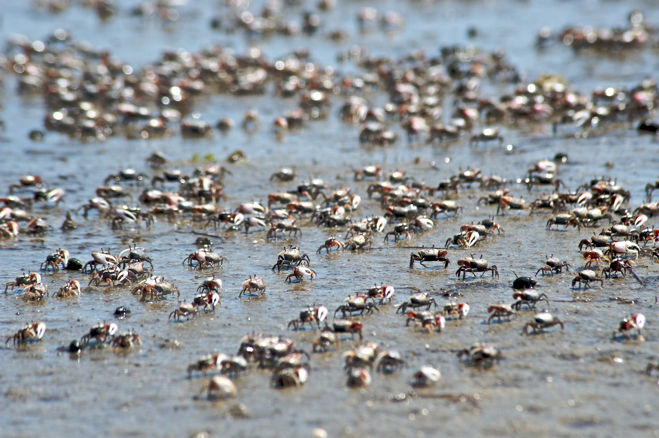 On warm days, on the sound side of the islands, fiddler crabs scan the sands for diatoms. Diatoms are single-celled algae and are producers in the food chain.