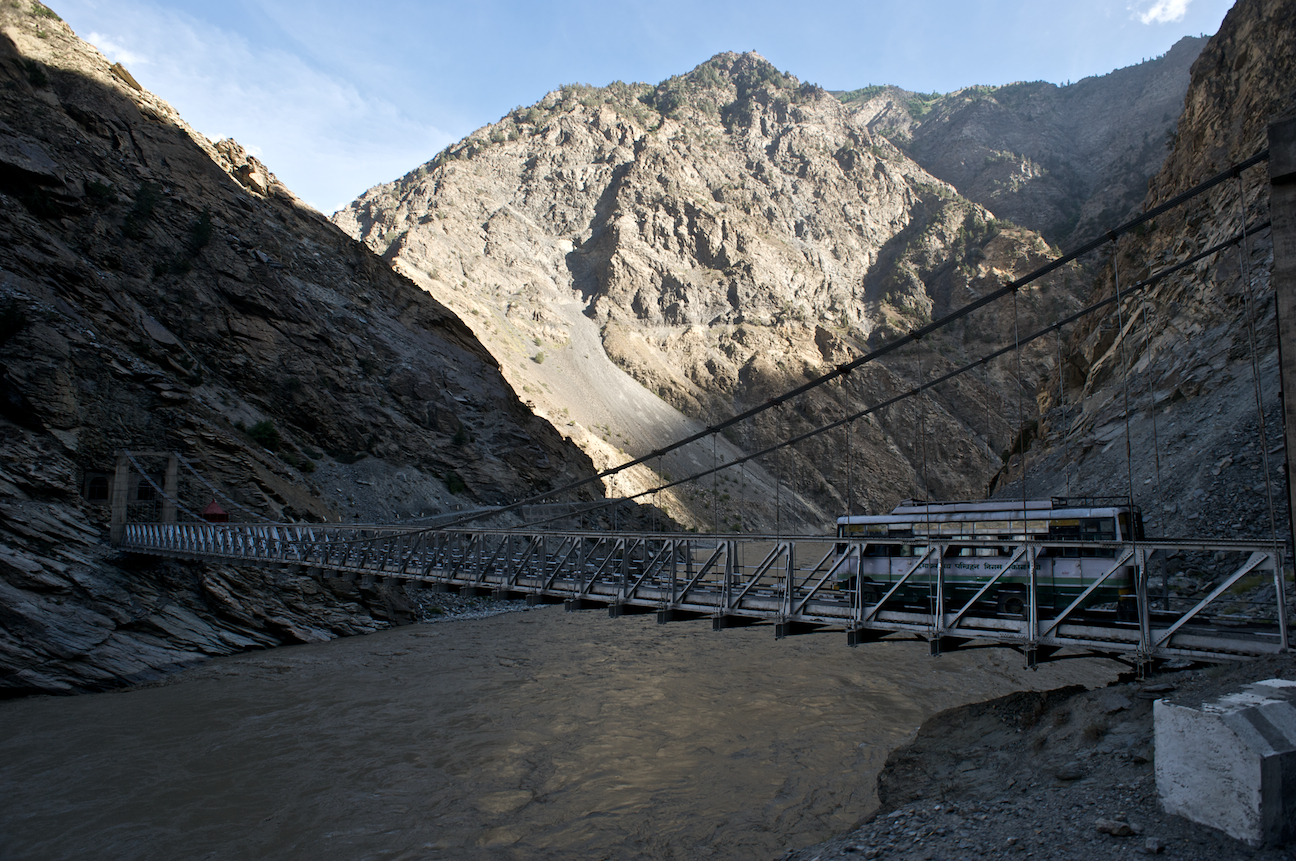 There is one steel bridge that connects Nesang Village to the highway. One villager proudly told me that the bridge has withstood two massive floods that would have washed their old bridges away. Here, a school bus makes its way across the Sutlej River.