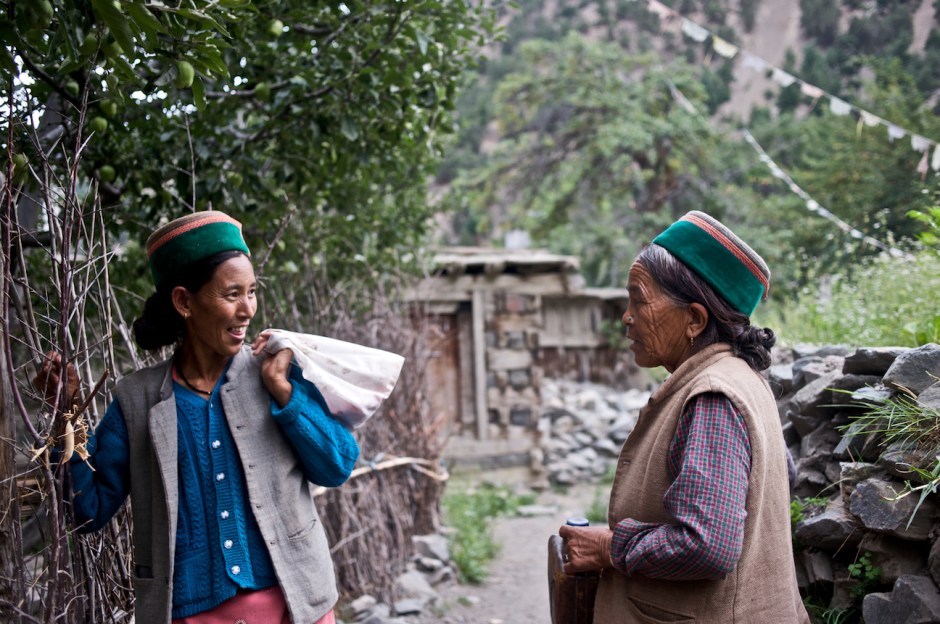 Neighbors pause to chat at the end of the workday in the village of Giabong in the Ropa Valley.