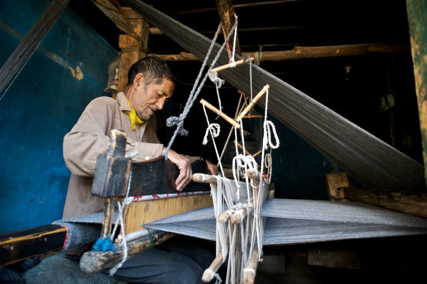 Carpet making is a huge industry in South Asia and one in which someone can earn a living after only a few months of training. Here a man is weaving carpets in his home.