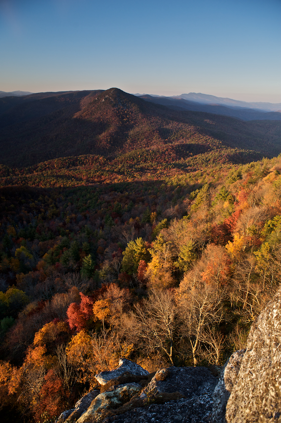 Fall Colors adorn the trees between Table Rock Mountain and Hawksbill Mountain in the Pisgah National Forest, North Carolina. Photo made on the rocky outcropping just above Devil’s Cellar.