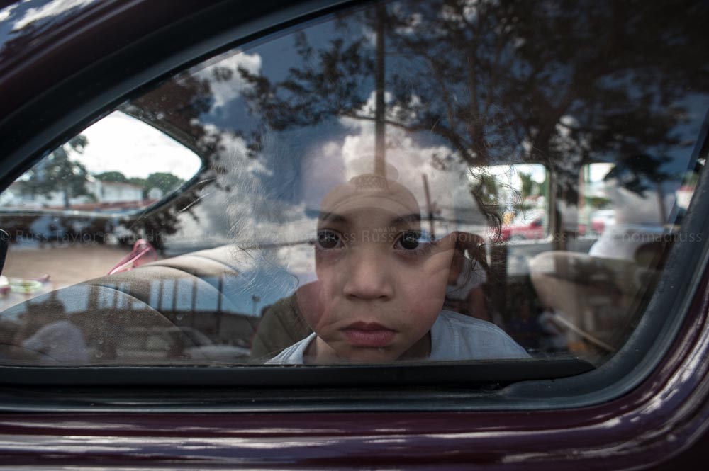 A young girl looks out the window of her family’s car as it makes its way down the parade route