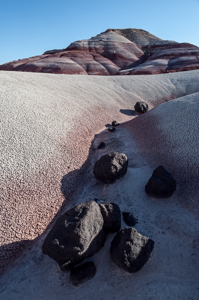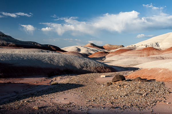 The bentonite hills are colorful and the surface is quite dry and crusty, until the monsoon rains fall, when they become impassable, slippery clay. Volcanic stones of unknown origin are spaced throughout the landscape.
