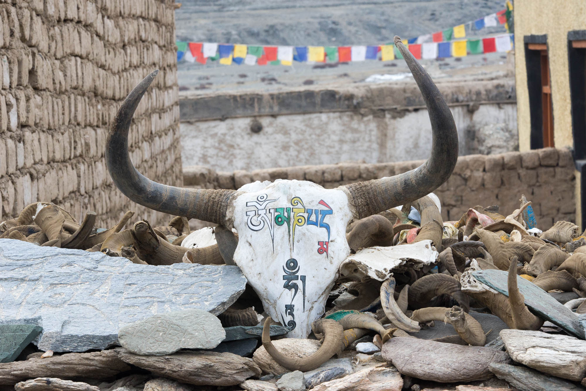A yak skull with the phrase Om Mani Padme Hum and rams horns adorn a wall.