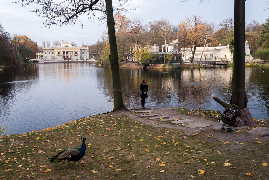 A peacock wanders into the scene as a young man photographs his girlfriend, Park Lazienkowski, Warsaw