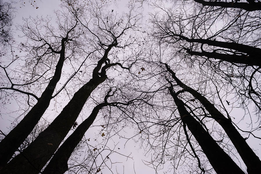Birds rest high among the branches, as the last leaves of autumn cling to life. Soon the trees will be but winter’s bones.