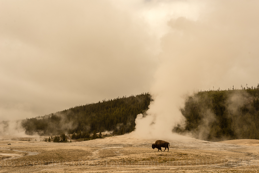 A bison slowly meanders in front of Old Faithful on a cold spring afternoon minutes before Old Faithful was to erupt.