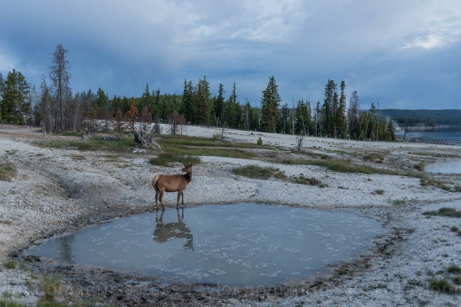 As I walked the boardwalks into the basin I was surprised to find elk wandering among the features, attempting to get a drink from their edges. I was the only human there.