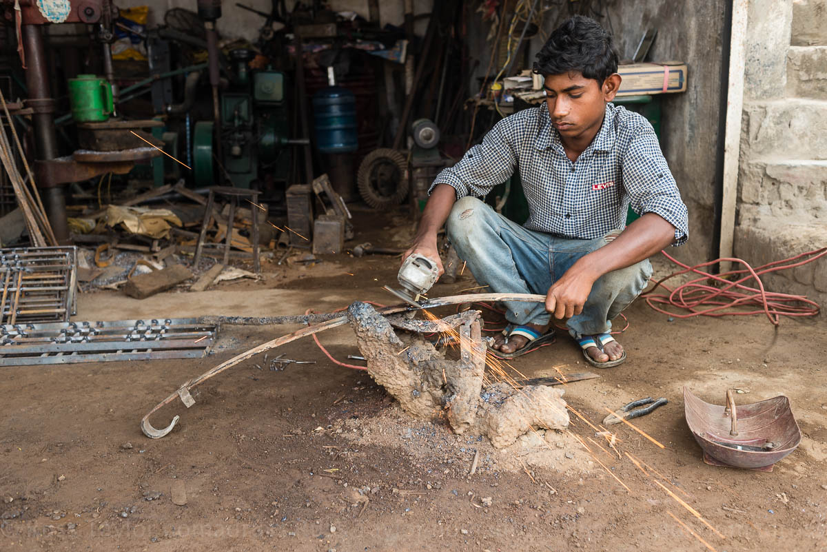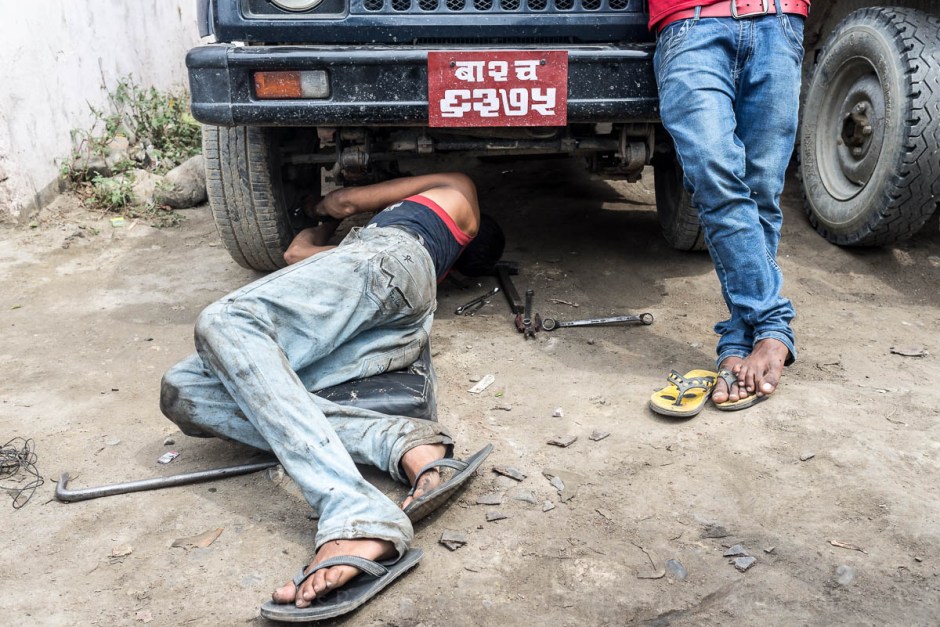 As sometimes happens when traveling over rough terrain, our jeep broke down. Fortunately we were near a small city at the time, giving me time to wander. The light was flat and it was all I could do to find a scene to gather in the essence of the city. Eventually I turned my lens towards the various repairmen who were working on the jeep.