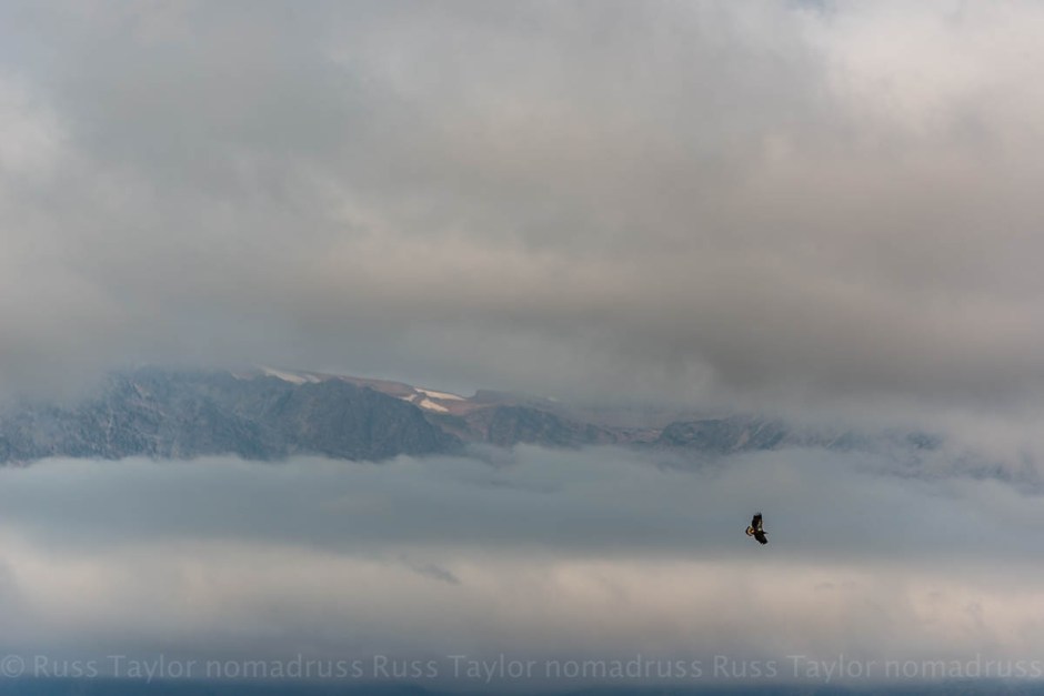 The mountains remained obscured through late in the morning, occasionally giving glimpses of a promise. A young eagle soared beneath the peaks.
