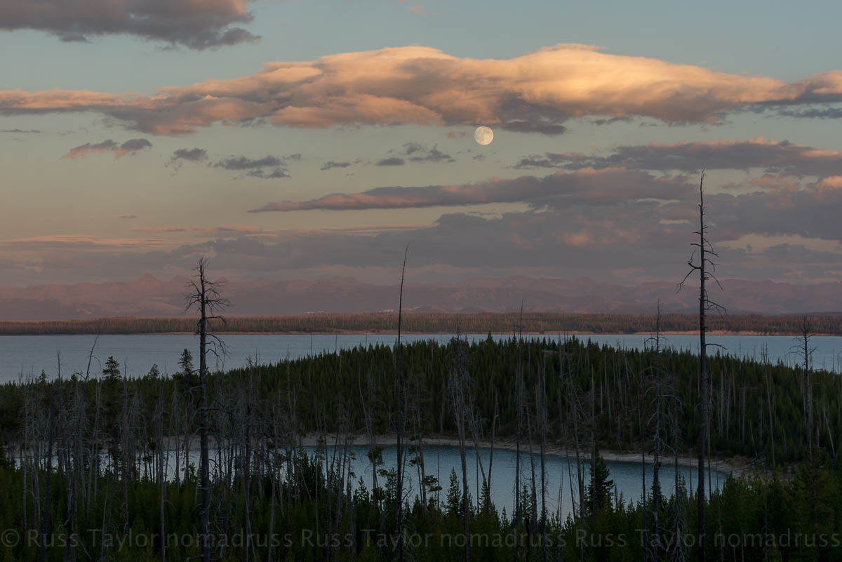 “Let’s shoot the moon in the Tetons,” I said. I’d become quite obsessed with photographing in the park adjacent to mine. As soon my duties were ended I cranked over the old red truck and me and my friend hit the road. Just after crossing the continental divide we began to descend towards Yellowstone Lake and the moon, already basically full, was rising.