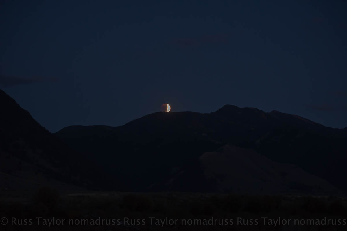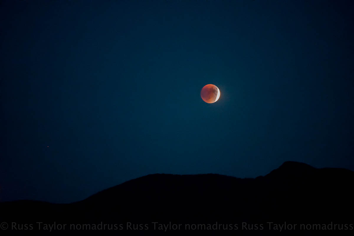 It was with great anticipation that we watched for the moon. It rose on the very crest of the ridge we’d counted on. The eclipse was well underway when it appeared on the horizon. As it rose it turned crimson.
