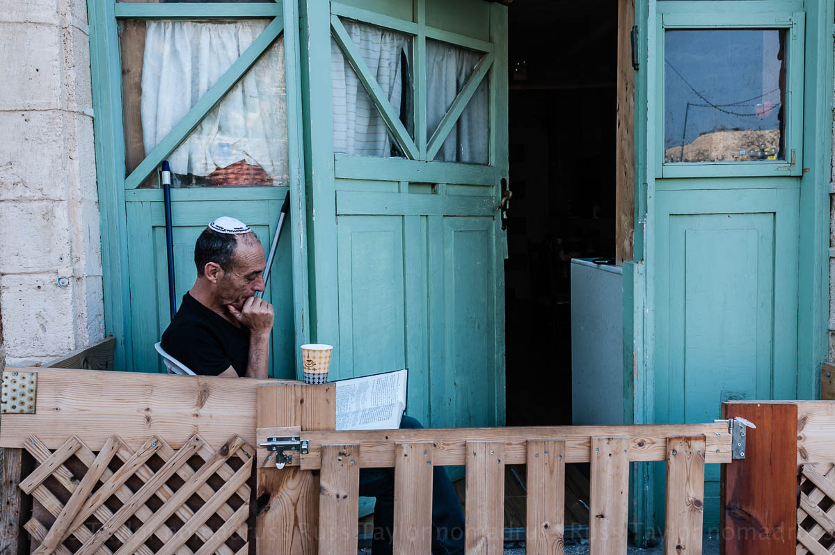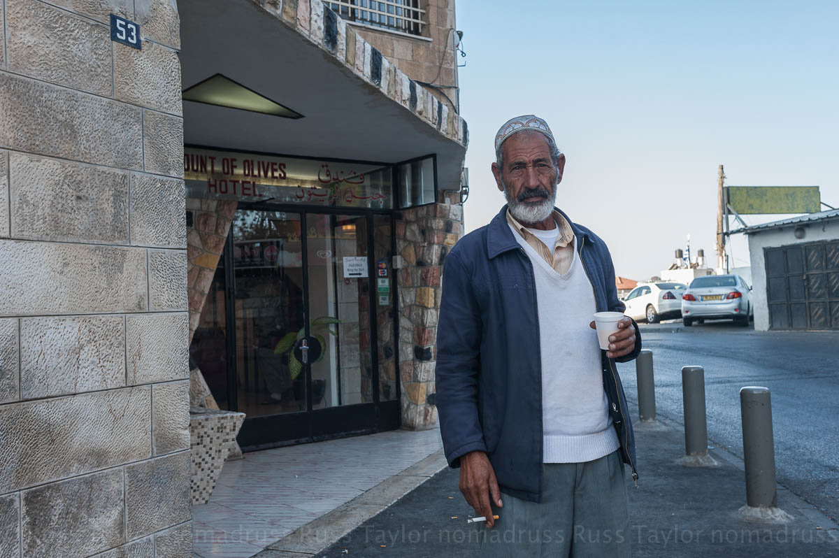A man enjoys his morning coffee and a smoke in a little town just above the Mount of Olives.