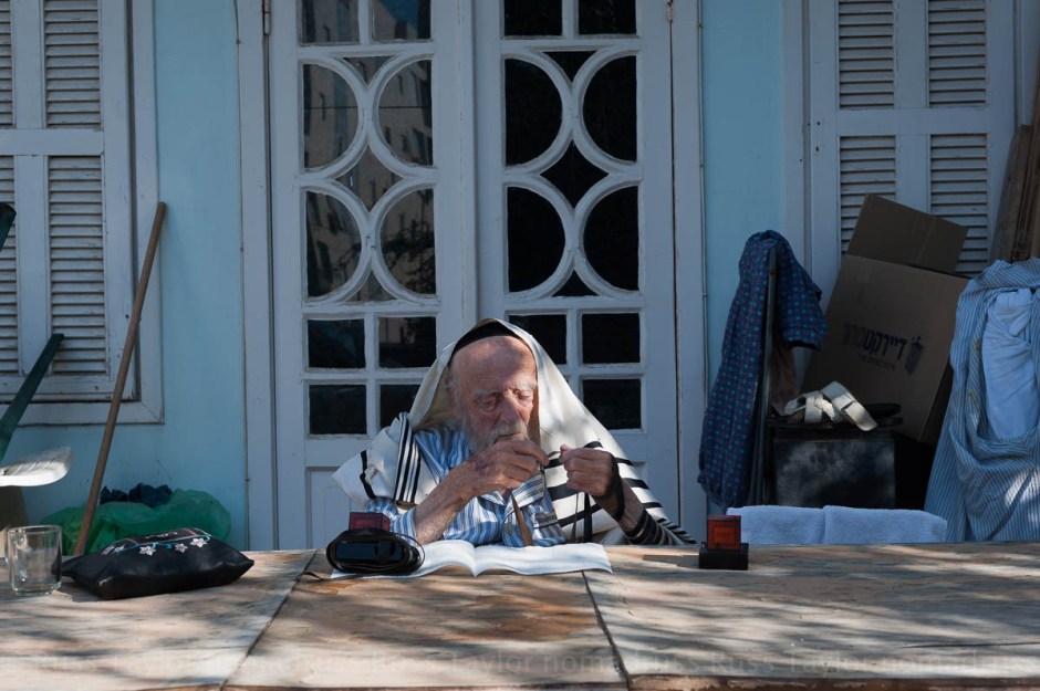 An old man places a phylactery on his wrist. A phylactery is a small leather box placed on the wrist by Jewish men during morning prayers to remind one to keep the law.