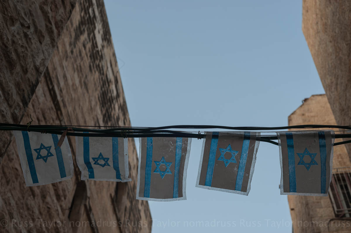 The Star of David on miniature flags dropped across some power wires in the old city of Jerusalem.