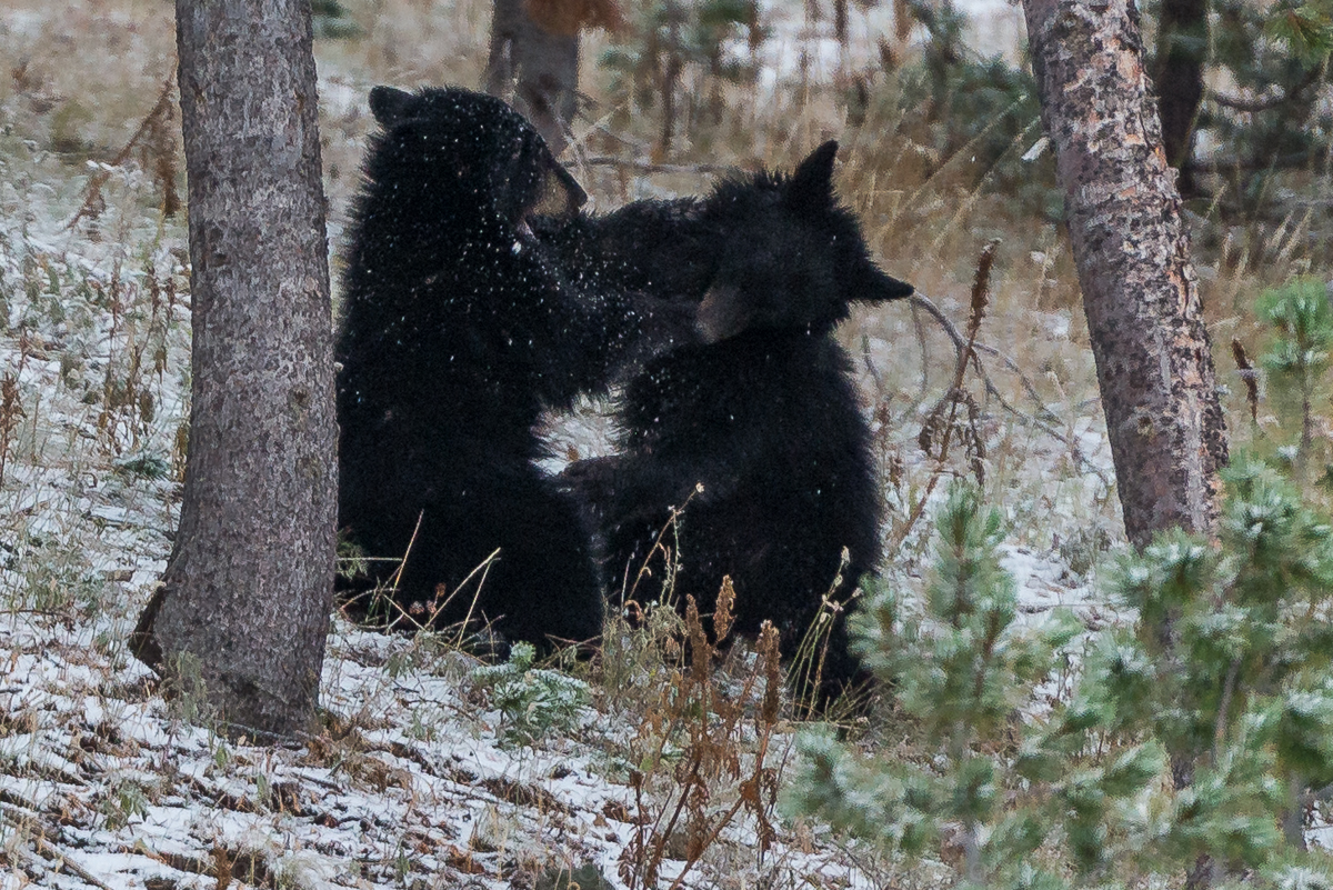 Traveling across the slopes of Mt Washburn in the heart of Yellowstone I ran across a mama bear and her two cubs. Mama was climbing trees in search of those ever so tasty pine cones. She was in the high branches, tossing the cones to the ground, where her little ones were eagerly awaiting their meals. For a while you could hardly see her through the branches. As she began to descend I was able to train my lens on her, and as she descended one of her cubs began to climb. The highlight of those few moments for me, was later watching the cubs briefly engage in some playful banter in the snow.