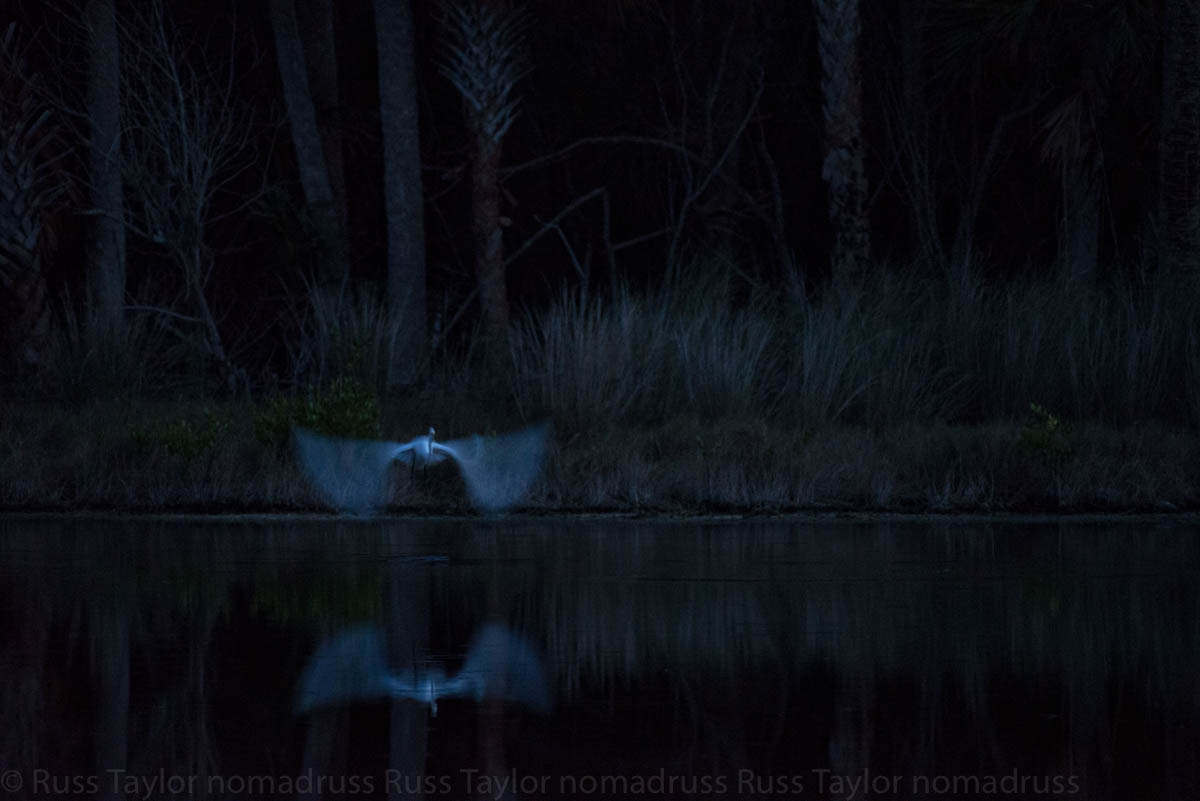 I was shooting at the Merritt Island National Wildlife Refuge and stayed into dusk. I was photographing a great egret, when a flock flew by, my shutter speed slow enough that that they blurred, but not with intention. I liked the idea, so I trained my camera back to the great egret, and decided to intentionally catch it’s flight and fortunately it worked just the way I’d hoped. RBT_4973