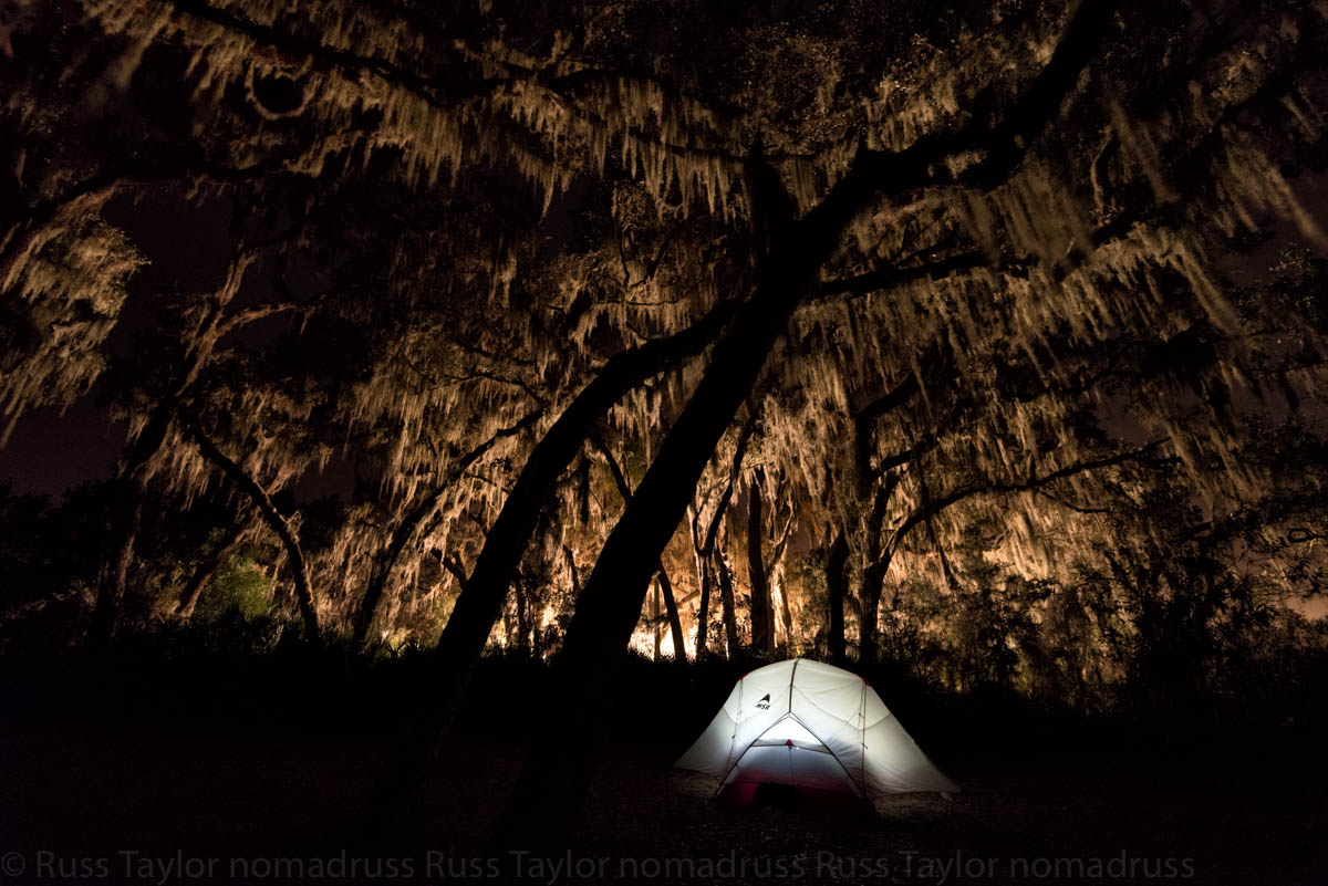 The campground I’d aimed for was full, it was all that photographing during the day. Serendipitously it led to a small, undeveloped campground in Hopkins Prairie, in the Ocala National Forest. It was rainy and overcast the entire trip, but it didn’t dampen any spirits, in fact, the rain dripping through the live oaks and Spanish moss was quite magical. The campground, beneath the live oaks, sits on a peninsula surrounded by prairie. It’s a place to which I’d love to return.