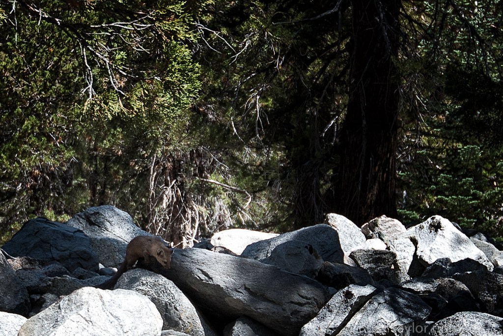 I ran across a scene most uncommon just before crossing the Woods Creek Bridge. An American Marten was out hunting for chipmunks! Such a rare sighting. I had one image of its little face looking at me through the rocks, which in my anxiousness to share with another trekker, accidentally deleted. It is a great loss, but it remains in my mind and it’s now only between me and God, and no other. Fortunately I kept this image of the Marten looking in the crevasses for the chipmunks. While I didn’t see it catch one, I did hear it. They are the cutest, and most vicious of creatures.